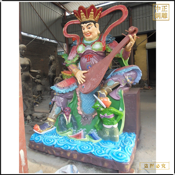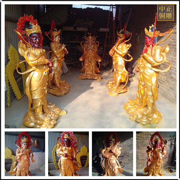 四大天王銅佛像是二十諸天中的四位天神銅像,它們所在的第一重天叫做四天王天,它們在寺廟的第一重殿的兩側,被稱為天王殿,四大天王自身的顏色都是不一樣的,所在在制作四大天王銅佛像的時候,通常都是彩繪的,這樣可以有利于人們對四大天王的區分,但是如果你了解四大天王,那么即使是鍍金的、青銅的、紫銅的四大天王銅佛像,也是可以區分的非常清楚的。