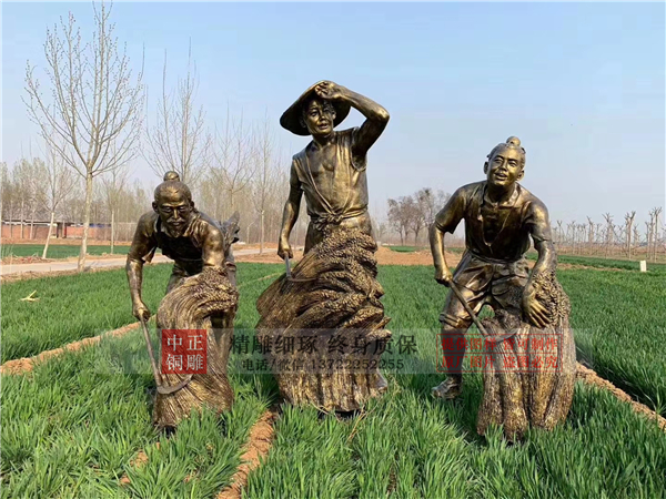 我公司生產的慶豐收主題景觀小品雕塑,從農耕到播種到秋收,涵蓋了整個勞動范圍,以寫實的手法塑造了一代農民對豐收的向往、對生活的追求,他們懷著樂觀 的心態,邁著堅實的步伐,眼神里透著堅毅,執著耕作在希望的田野上。