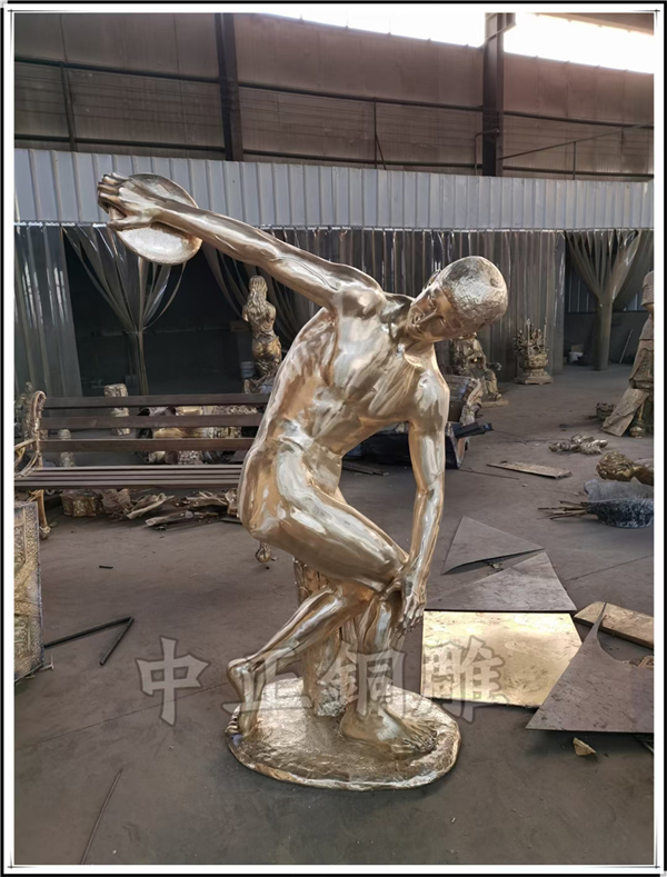 這件擲鐵餅者銅雕塑是根據古希臘古典時期米隆的雕塑代表作品《擲鐵餅者》仿造而來,擲鐵餅者這尊雕像被譽為“體育運動之神”,是體育運動和健美體魄的象征。