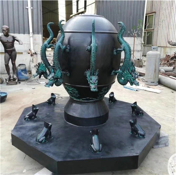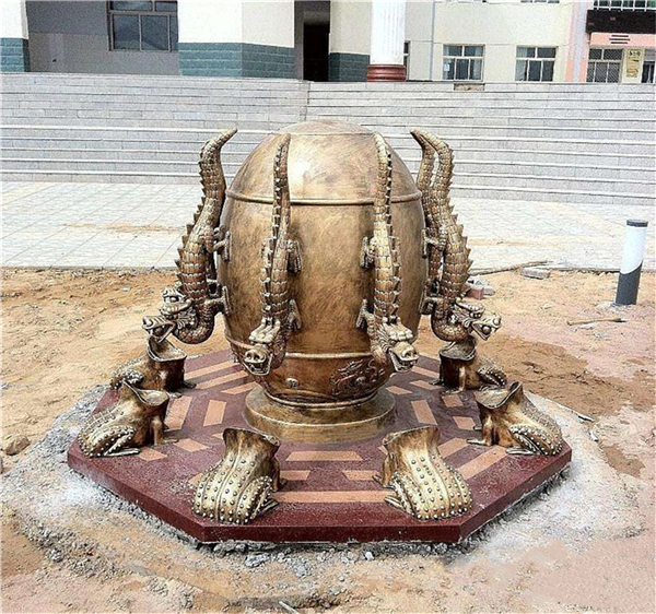 地動儀雕塑外面鑄有八條龍,它是按照八個方向來進行排列,我們從順時針方向來看,分別是北、東北、東、東南、南、西南、西、西北,并且是與地動儀內部相銜接而成的,并不是獨立得,在每一條龍嘴里都銜著一枚銅球,而銅球幣則是根據所在方向來動,會落在它下面排列的銅蟾嘴中,憑聲音就可以去判斷地震的方向。