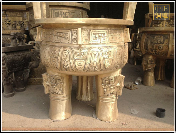 鼎本來是古代的烹飪之器,相當于現在的鍋,用以燉煮和盛放魚肉。銅鼎有三足圓鼎,也有四足方鼎。最早的鼎是黏土燒制的,后來有了青銅鑄的銅鼎。青銅器作為中國文化的代表,都有仿造青銅器的作品誕生。