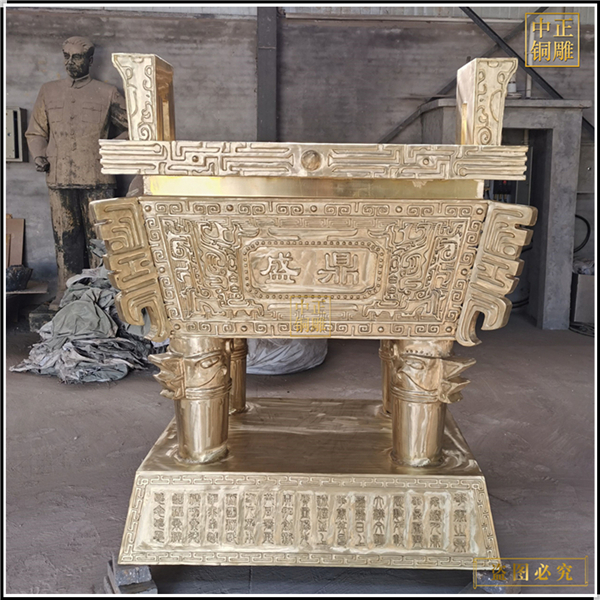 安置在廣場中,廣場雕塑顧名思義就是在廣場上放置的藝術(shù)品,其制造材料是,主要是供人們欣賞,其欣賞價值高,隨著社會的進步和城市化進程的加快,廣場雕塑也越來越受大家的青睞。青銅鼎盛四足方鼎可用材質(zhì)不僅局限于青銅,還可以是紫銅、黃銅等,所使用的工藝也不只是鑄造,還可以是著色、鎏金、貼金、鍍金等,尺寸和適用場所也非固定不變,具體請電話咨詢。