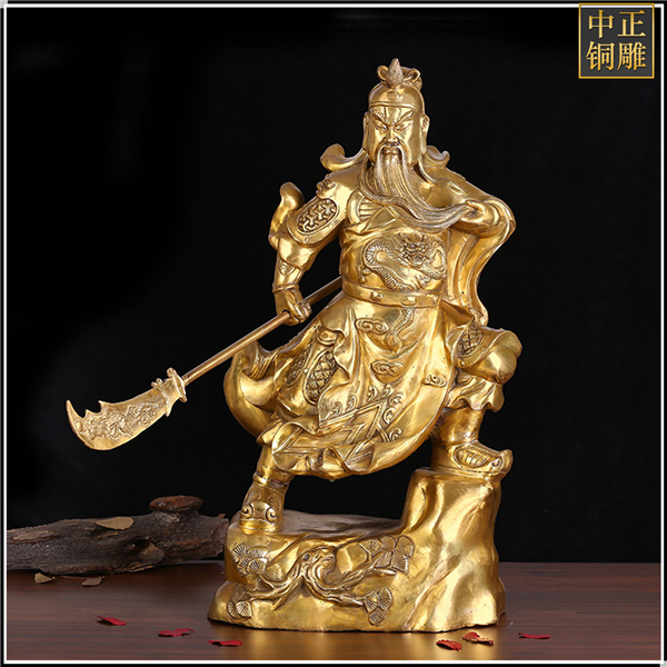 1、提刀關公:關公目視前方,面帶威嚴,左手捋須,右手提刀,刀鋒向下,武袍披身。提刀關公是關公文化的核心所在,也是我們最常見到的關公形象。提刀關公是義氣、招財的化身,有避邪鎮惡、驅煞制鬼之能,適合所有家庭和商業機構供奉。2、托印提刀關公:關公或左手捋須,右手持印,身后插刀;或左手持印,右手提刀,世相威嚴,端正而立。托印提刀關公多用于政府部門或廣場塑像之用,因為印象征著官祿和事業穩如泰山;刀象征著勇往向前,與時俱進。
