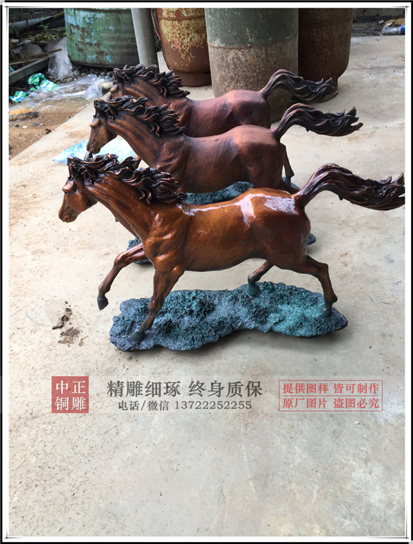 馬到成功是人們對馬能夠帶來好運(yùn)的一種說法,家里放一些馬的裝飾品效果也很好。馬要放在驛馬方,也就是南方和西北方向,有益于運(yùn)氣的帶動。馬的數(shù)量以二、三、六、八、九匹為宜,這都是古人認(rèn)為能帶來吉運(yùn)的好數(shù)字,而六匹馬是最吉利的。因?yàn)椤傲迸c“祿”同音,有“祿馬交馳”的寓意,同理,五匹馬是“五馬分尸”的意思,切忌擺五匹馬。中正銅雕-工藝品銅馬,大型工藝品銅馬,工藝品銅馬雕塑,我廠成立于2014年.我公司是唐縣銅雕的知名企業(yè),主要以各種大型銅雕鑄造加工于一體.主要產(chǎn)品有,寺廟佛像、香爐、銅鐘、城市雕塑、動物雕塑、偉人雕塑、西方人物、銅浮雕等,品種齊全,價格合理。